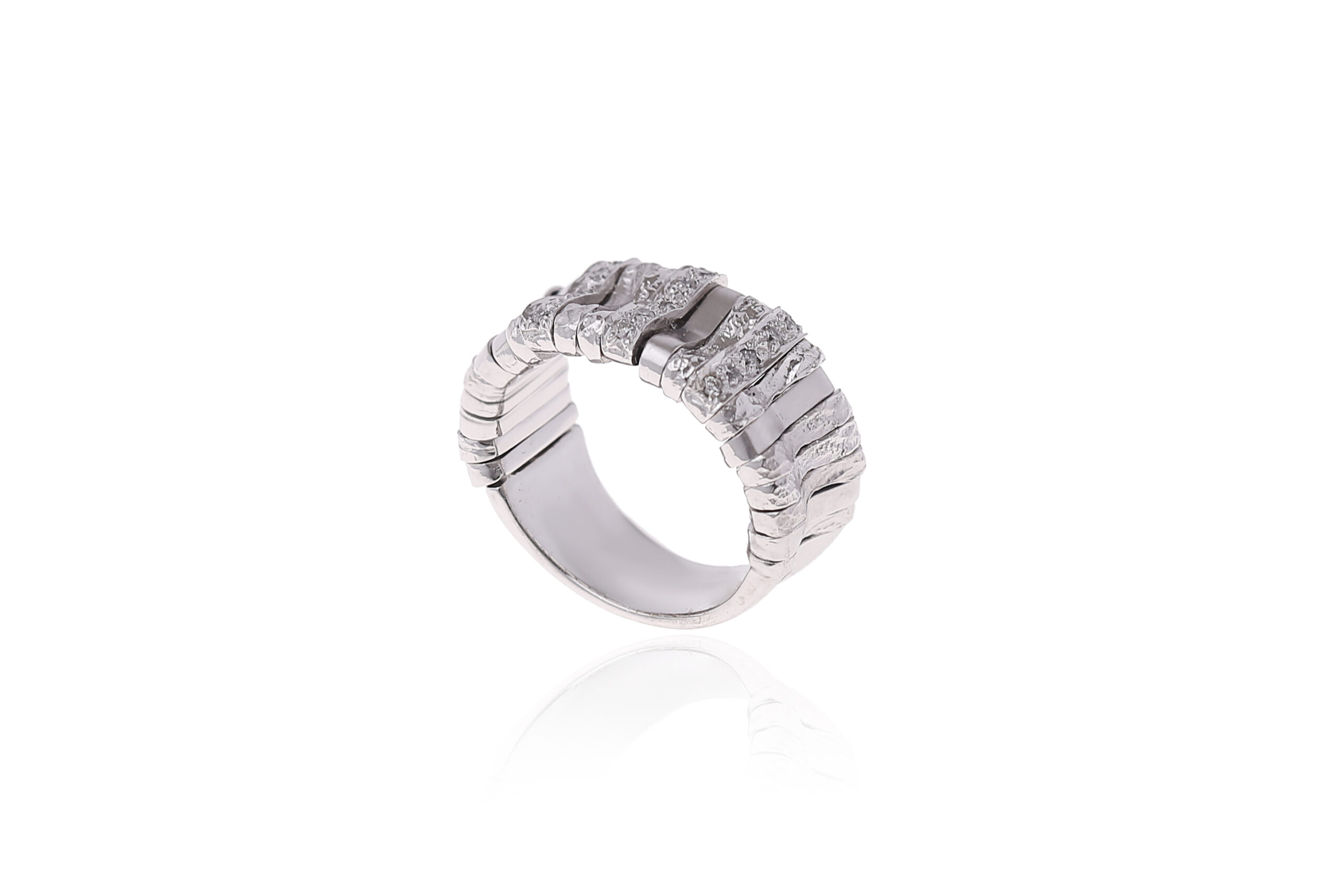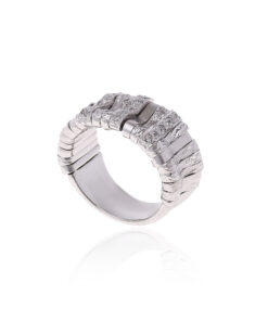 טבעת רחבה מזהב לבן 14 קראט עם מרקם חרוט המעוטרת בחריצים אנכיים.