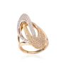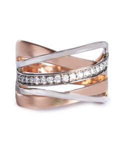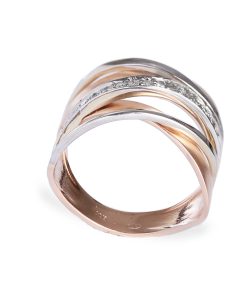 טבעת זהב 14 קראט המשלבת זהב אדום וזהב צהוב בעיצוב רצועות משתלבות עם שיבוץ.