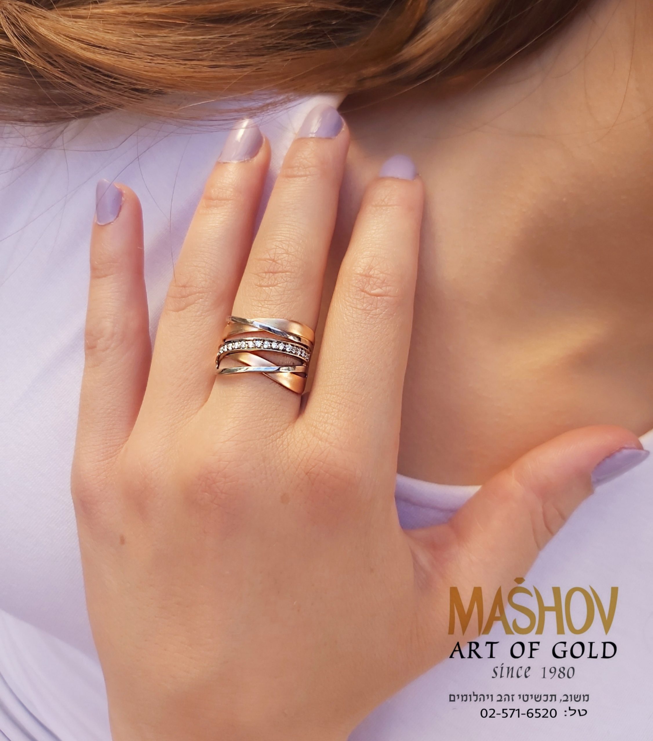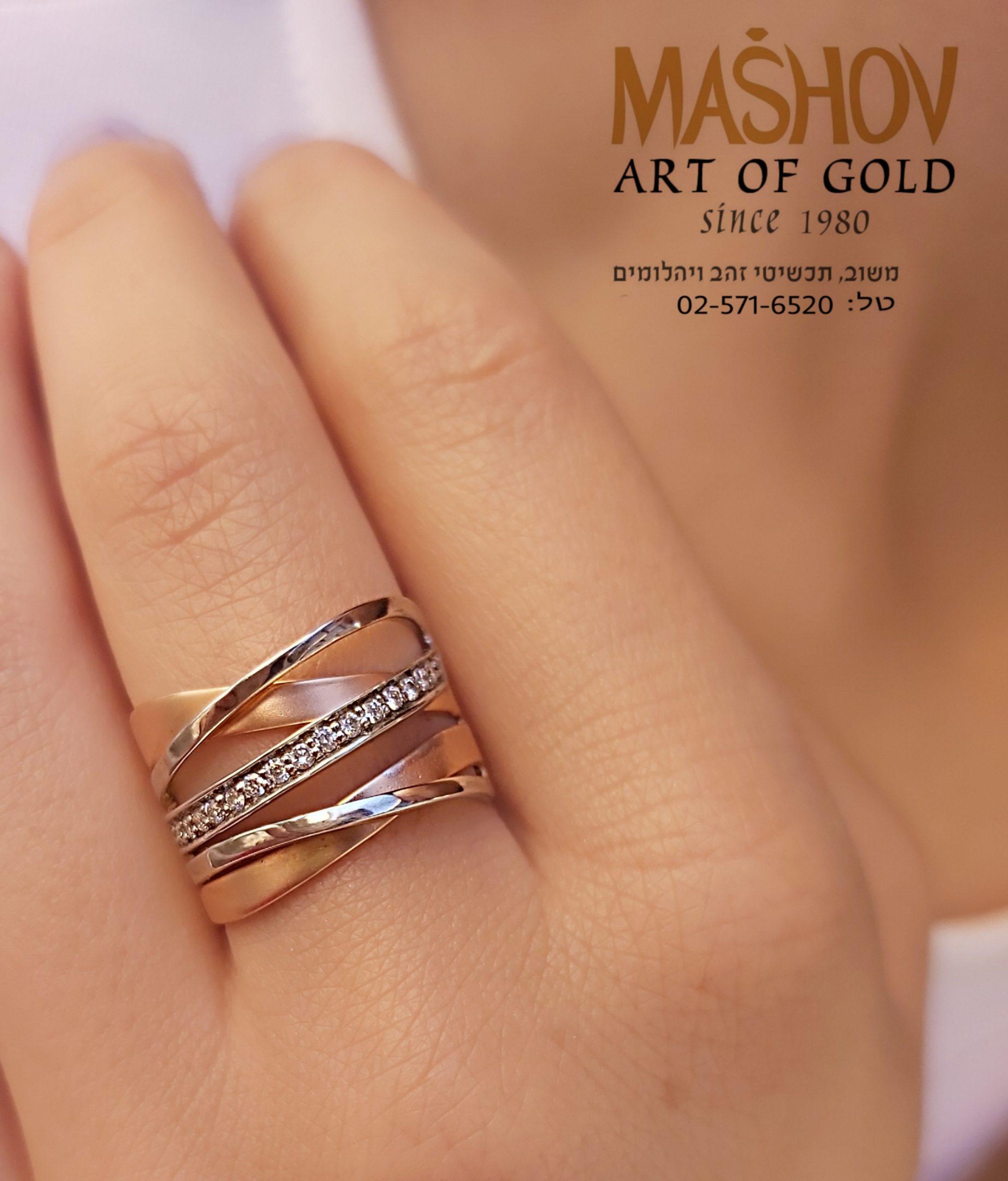 טבעת זהב 14 קראט המשלבת זהב אדום וזהב צהוב בעיצוב רצועות משתלבות עם שיבוץ.