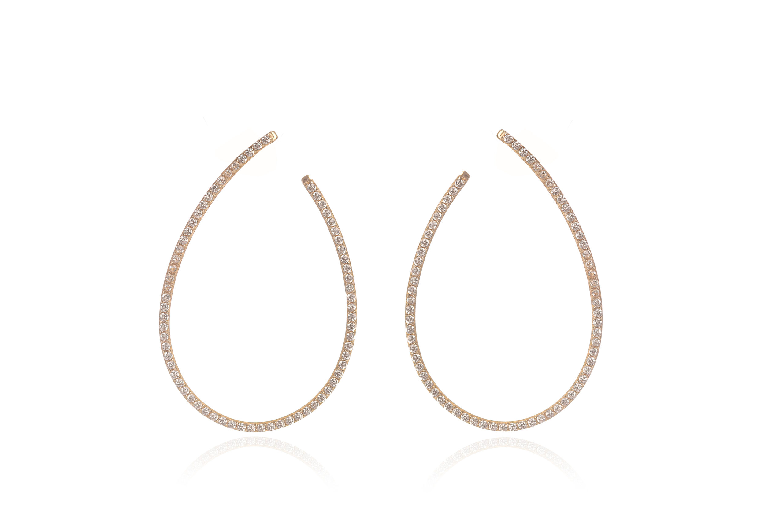 עגיליזהב צהוב 14 קראט, בצורת חישוק דמעה מוארך ופתוח, המשובץ לכל אורכו בזירקונים.