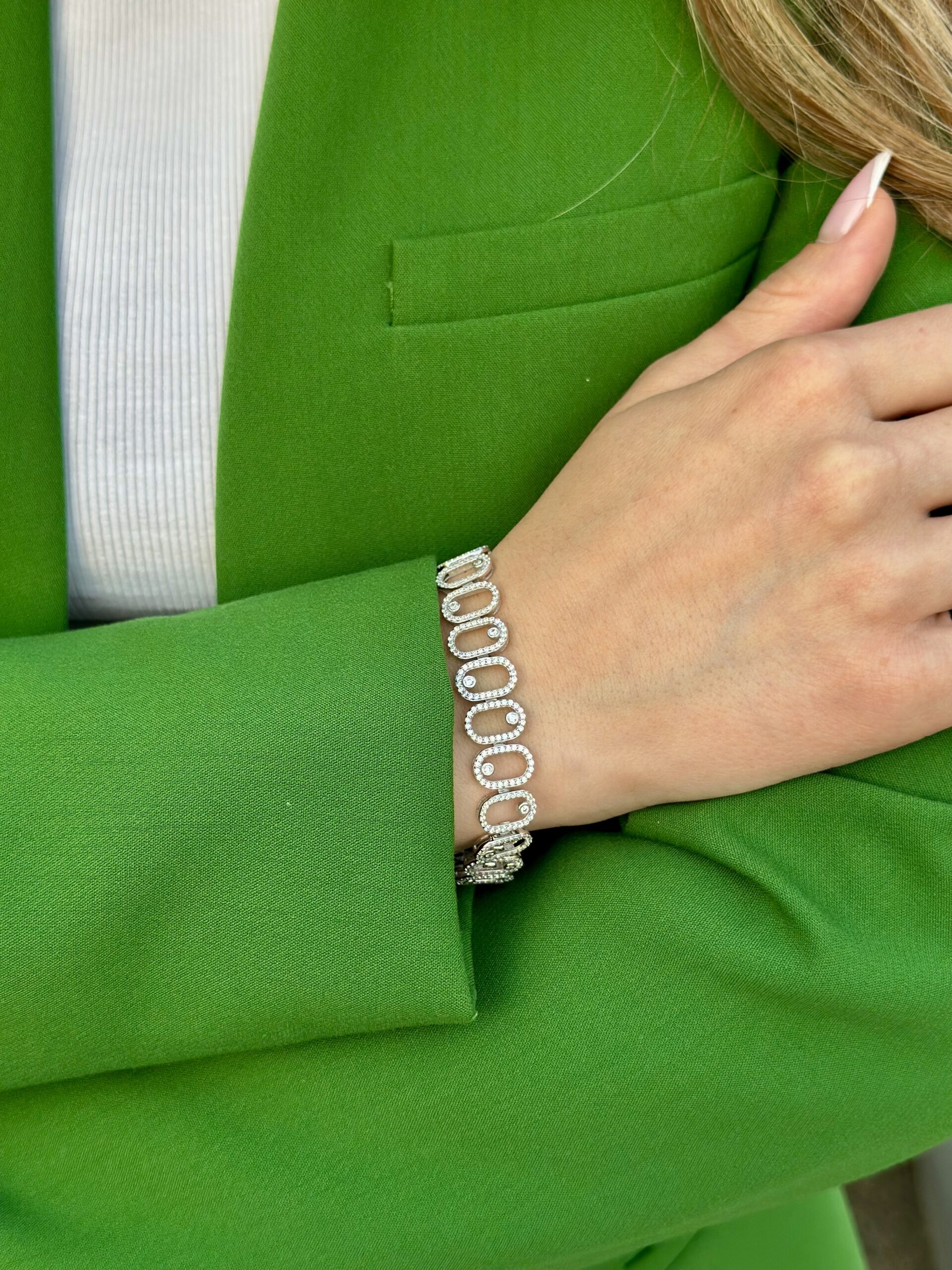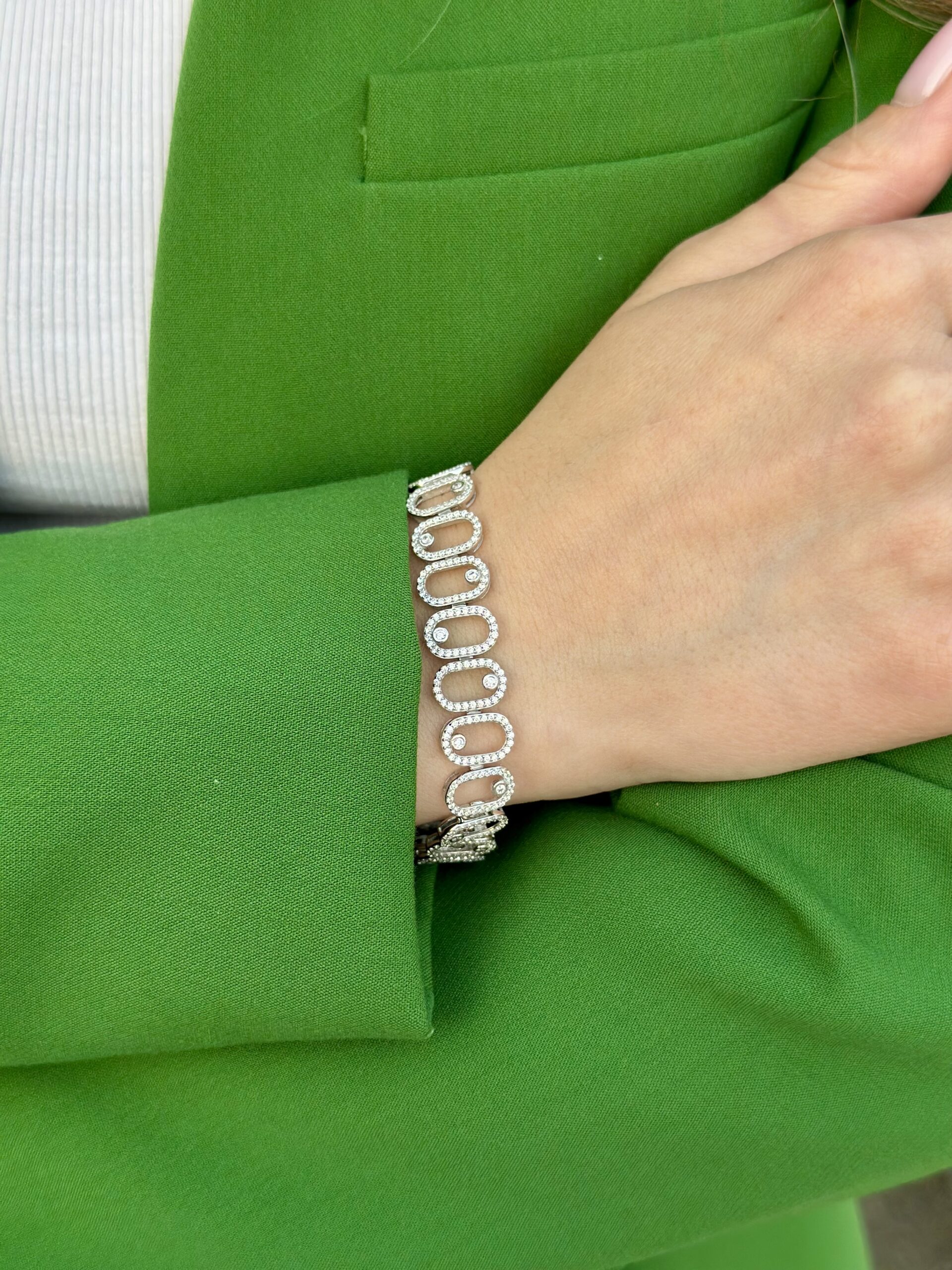 כל חוליה אובלית משובצת בשורה של אבני זירקון מבריקות, וביניהן אבן בודדת שמוסיפה נופך ייחודי.✨
