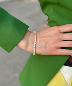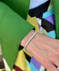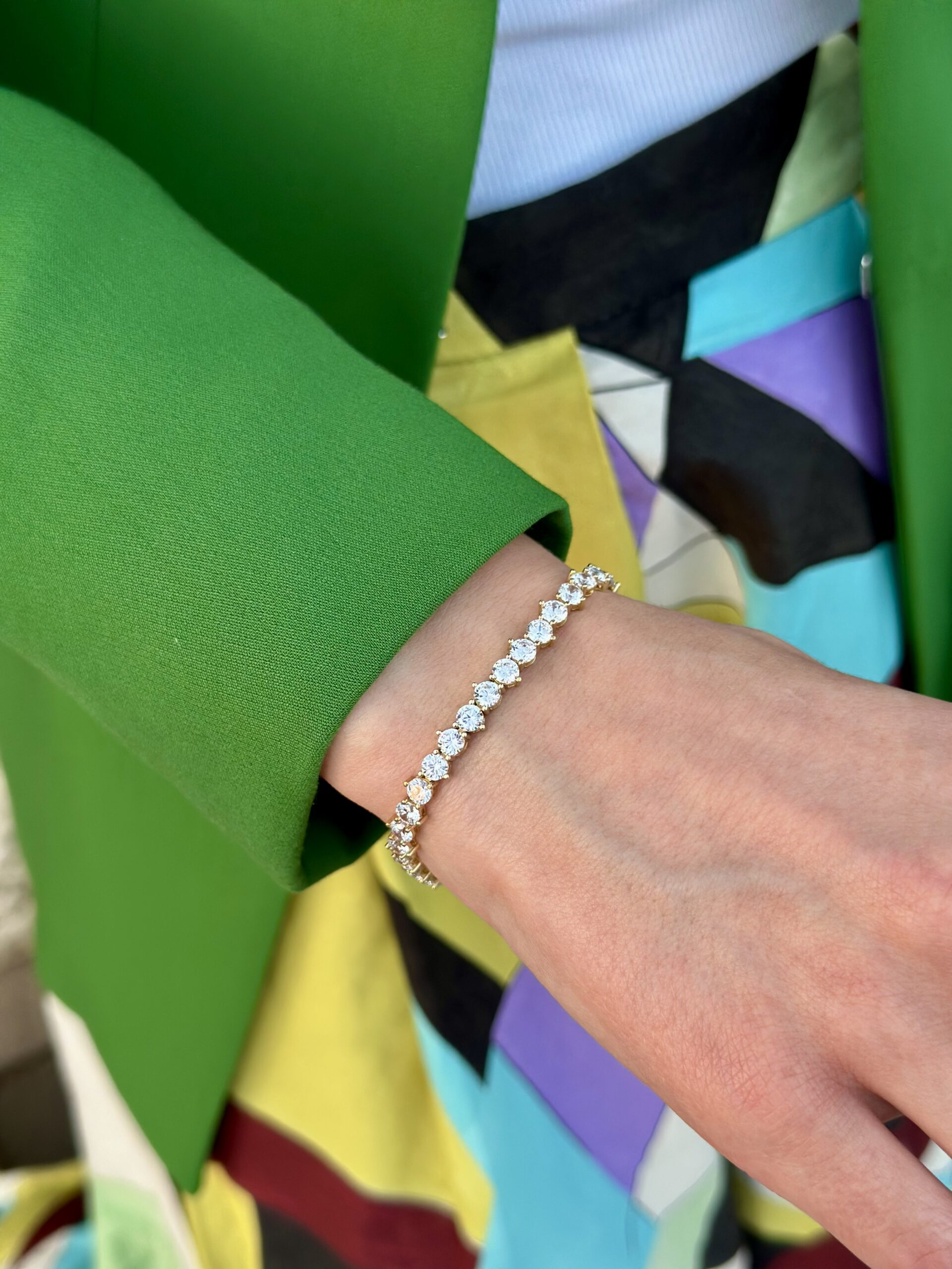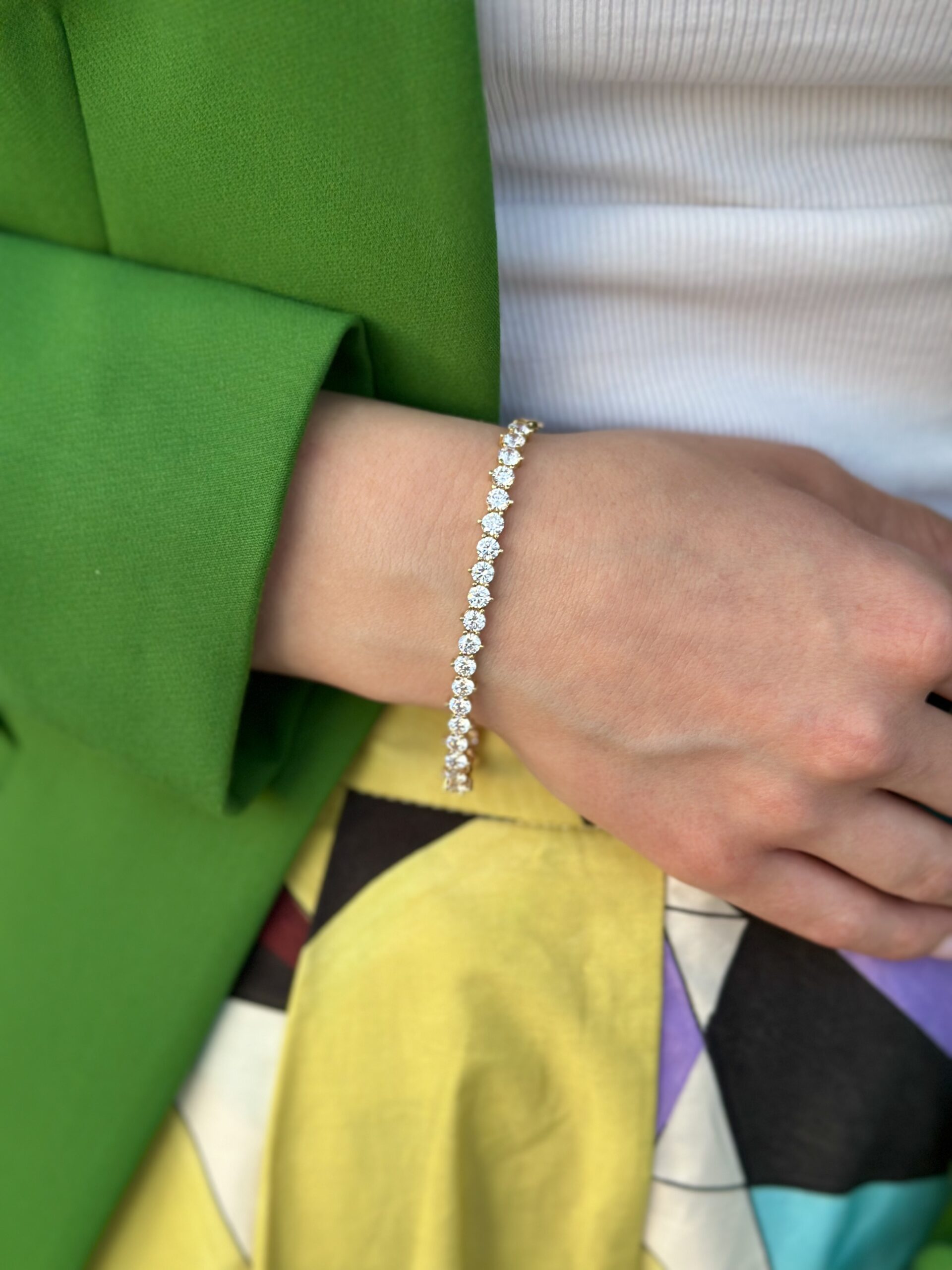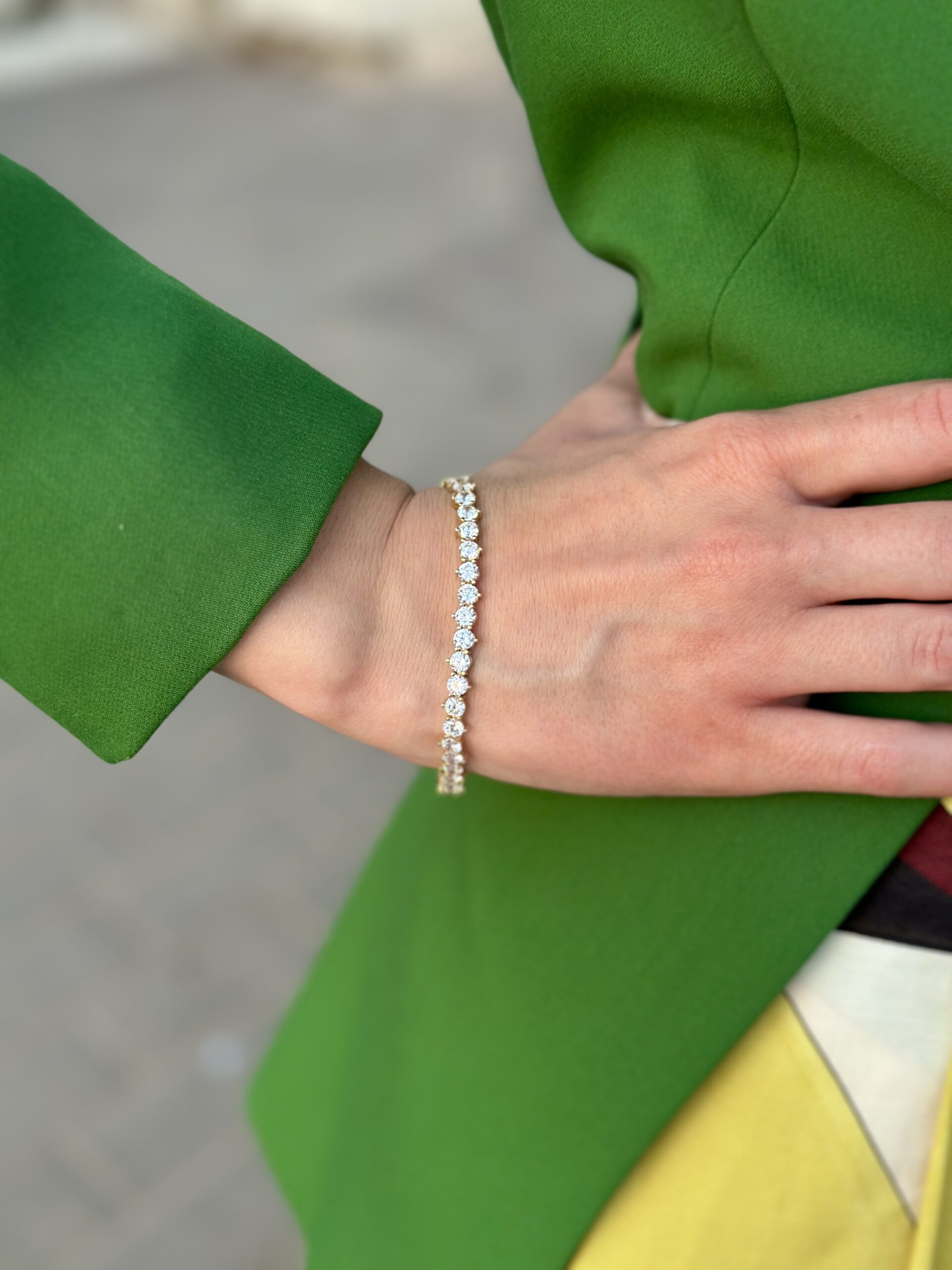 צמיד קלאסי עשוי זהב 14 קראט, משובץ לכל אורכו באבני זירקון עגולות.
