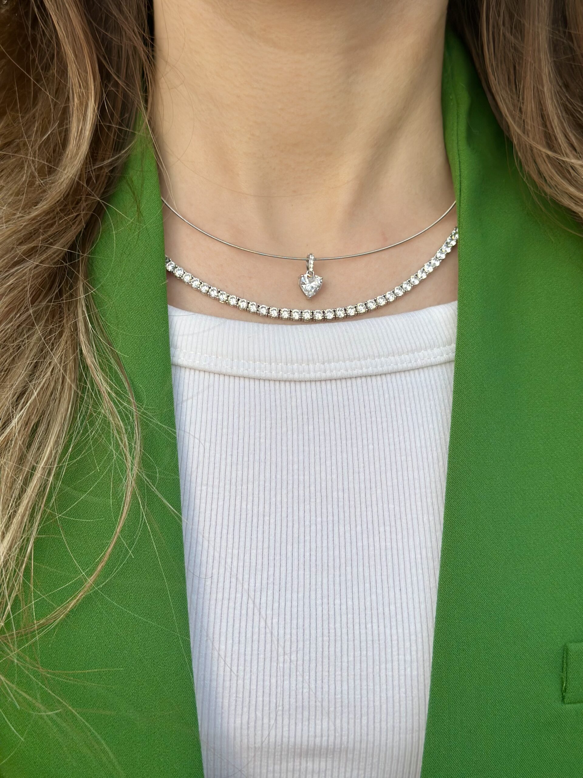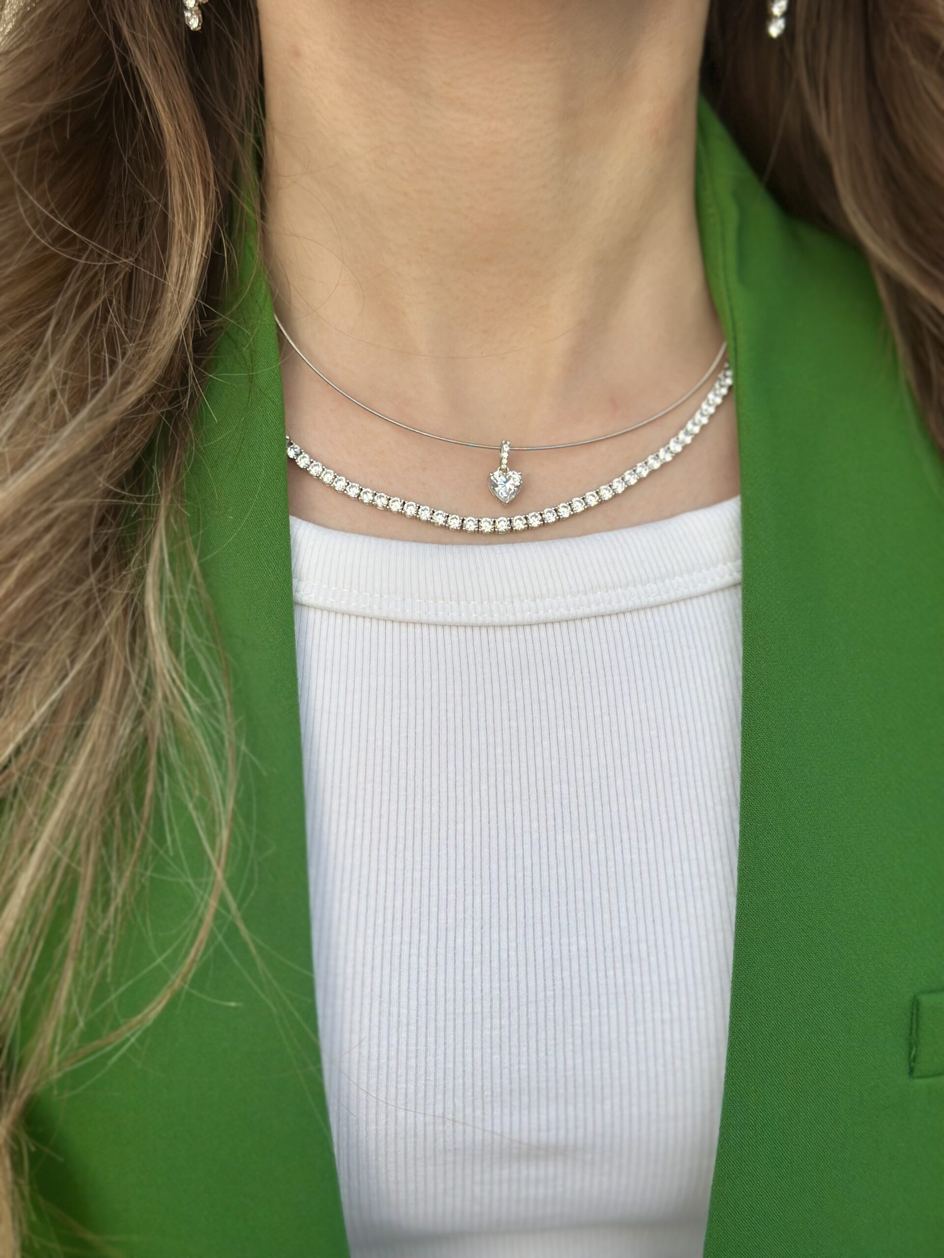 אבן זירקון יחידה ובוהקת, מעוצבת בצורת לב אלגנטי, נחה בעדינות על חוט דקיק.
